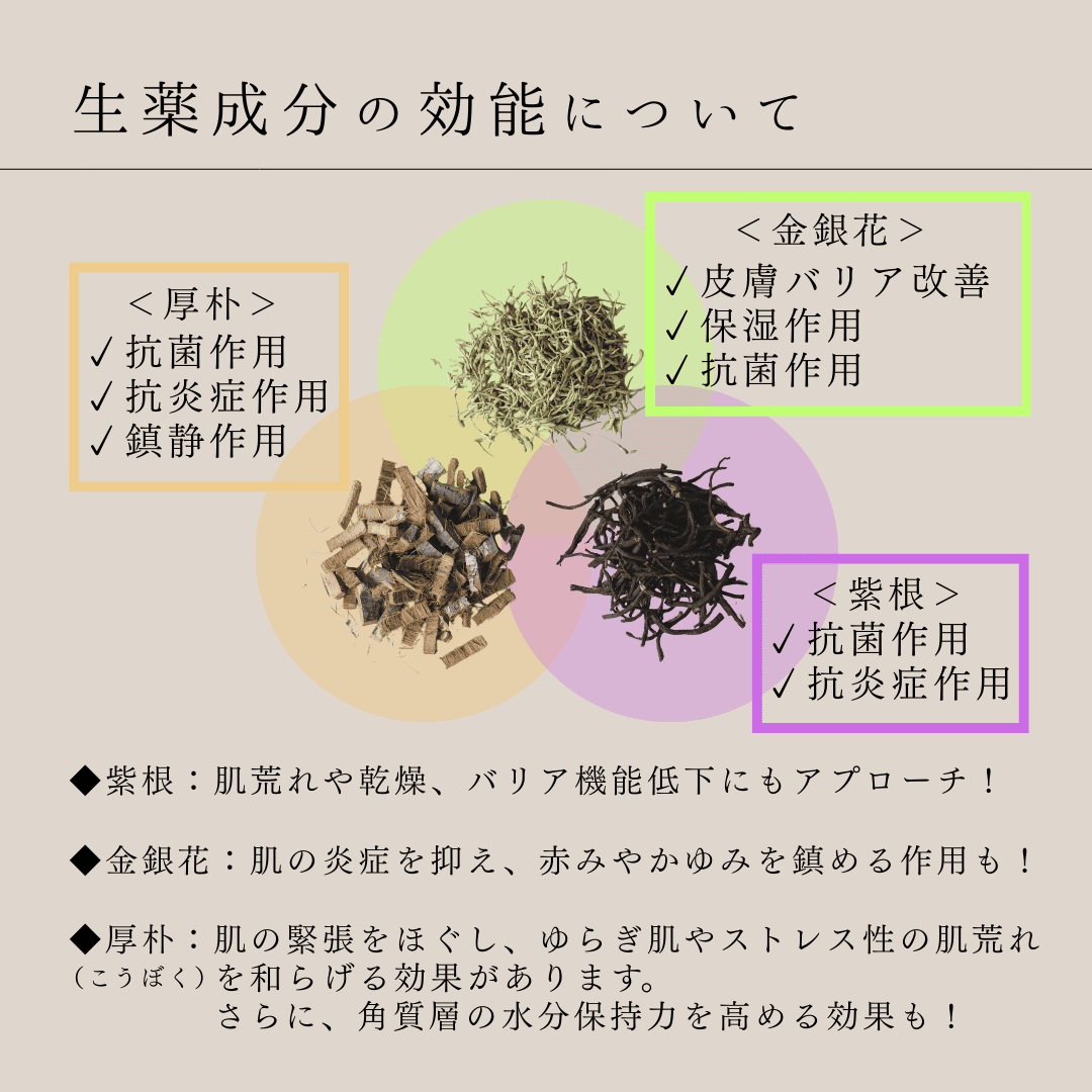 三種の生薬(厚朴・金銀花・紫根)を配合。