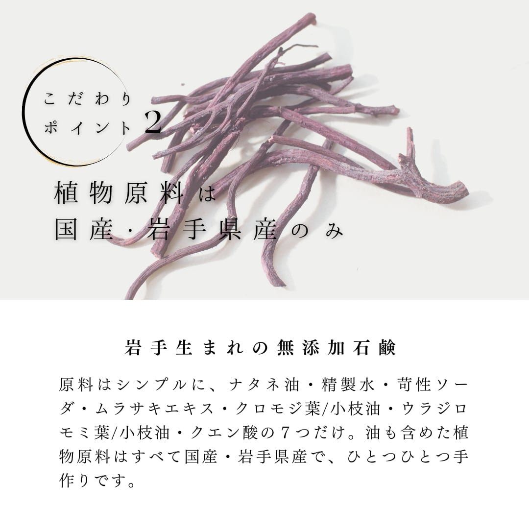 紫根配合、岩手の自然素材で手作り。全身洗える無添加石鹸です。